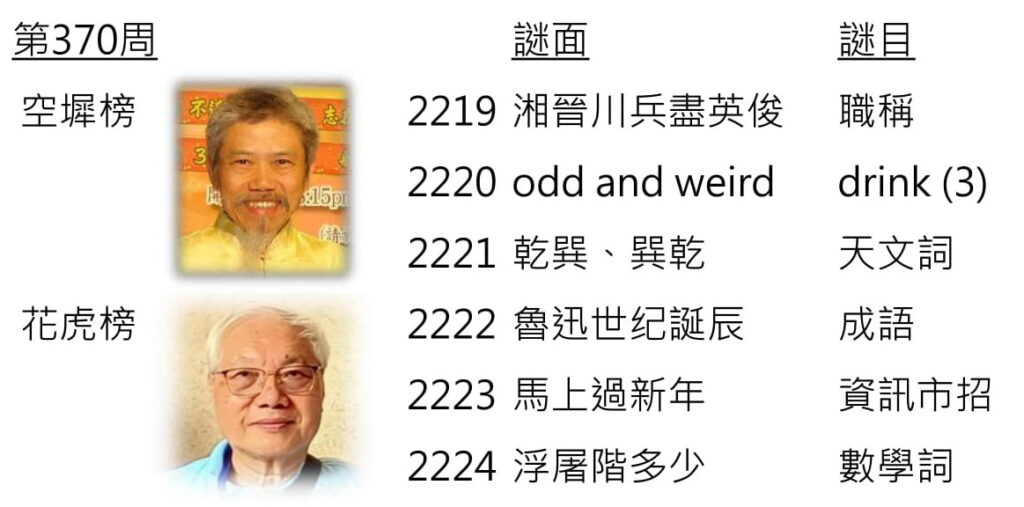下星期二(八月十二日)凌晨零時截止,下星期五(八月十五日)公布猜中之謎迷與排名,以及下一周謎題。